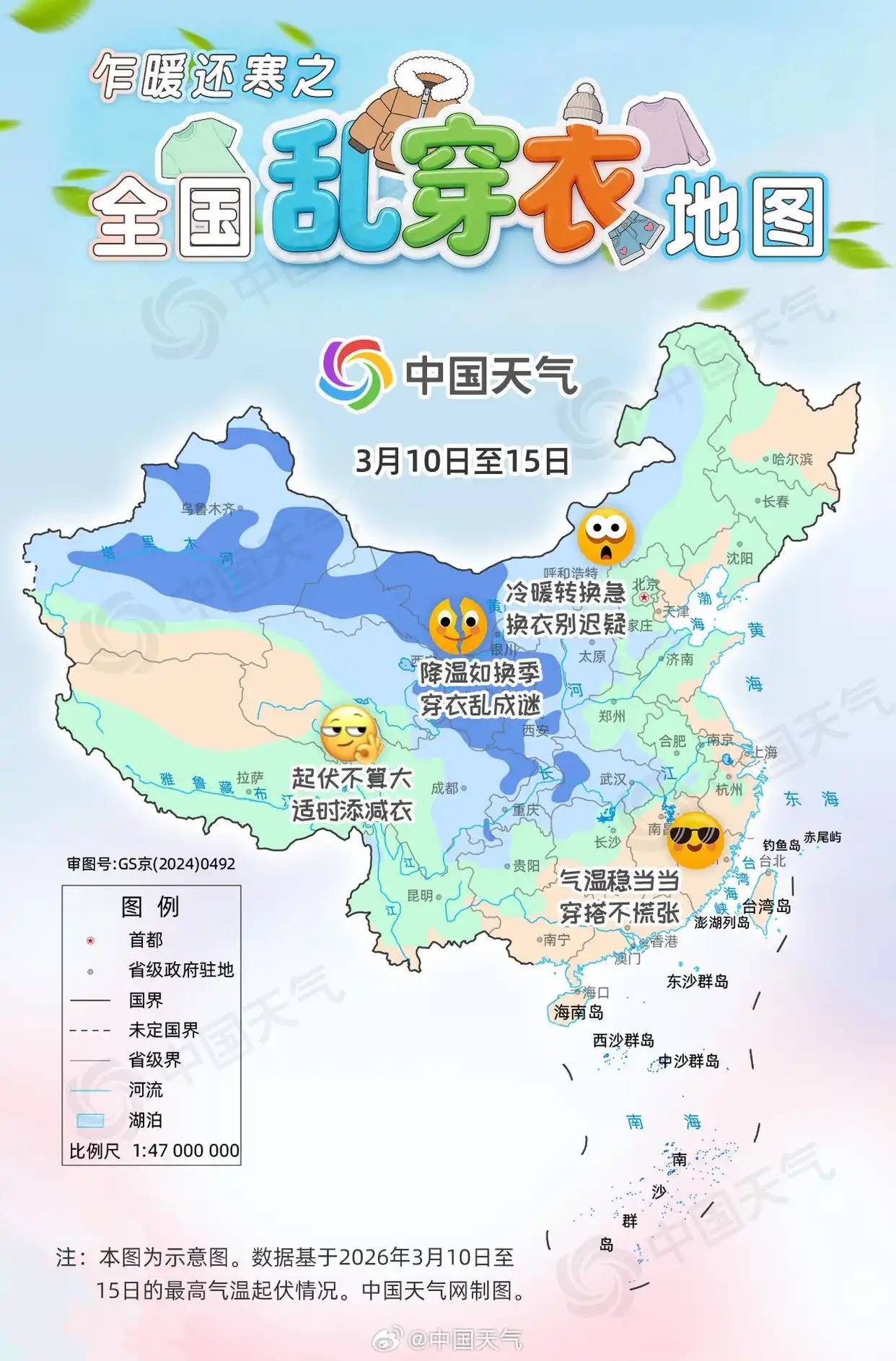3月气温起伏不定,天气忽冷忽热,又到了“乱穿衣”的季节。本周前期,我国大部偏暖,甘肃、新疆、重庆等地部分地区最高气温升至20℃上下,暖意融融。不过3月11日起至15日,受冷空气影响股票配资策略官网,我国多地将迎来气温“大跳水”,冷暖反差明显,刚脱下的厚外套又要重新穿上。中国天气特别推出全国乱穿衣地图,看看哪里穿衣乱成谜,哪里添衣别迟疑。