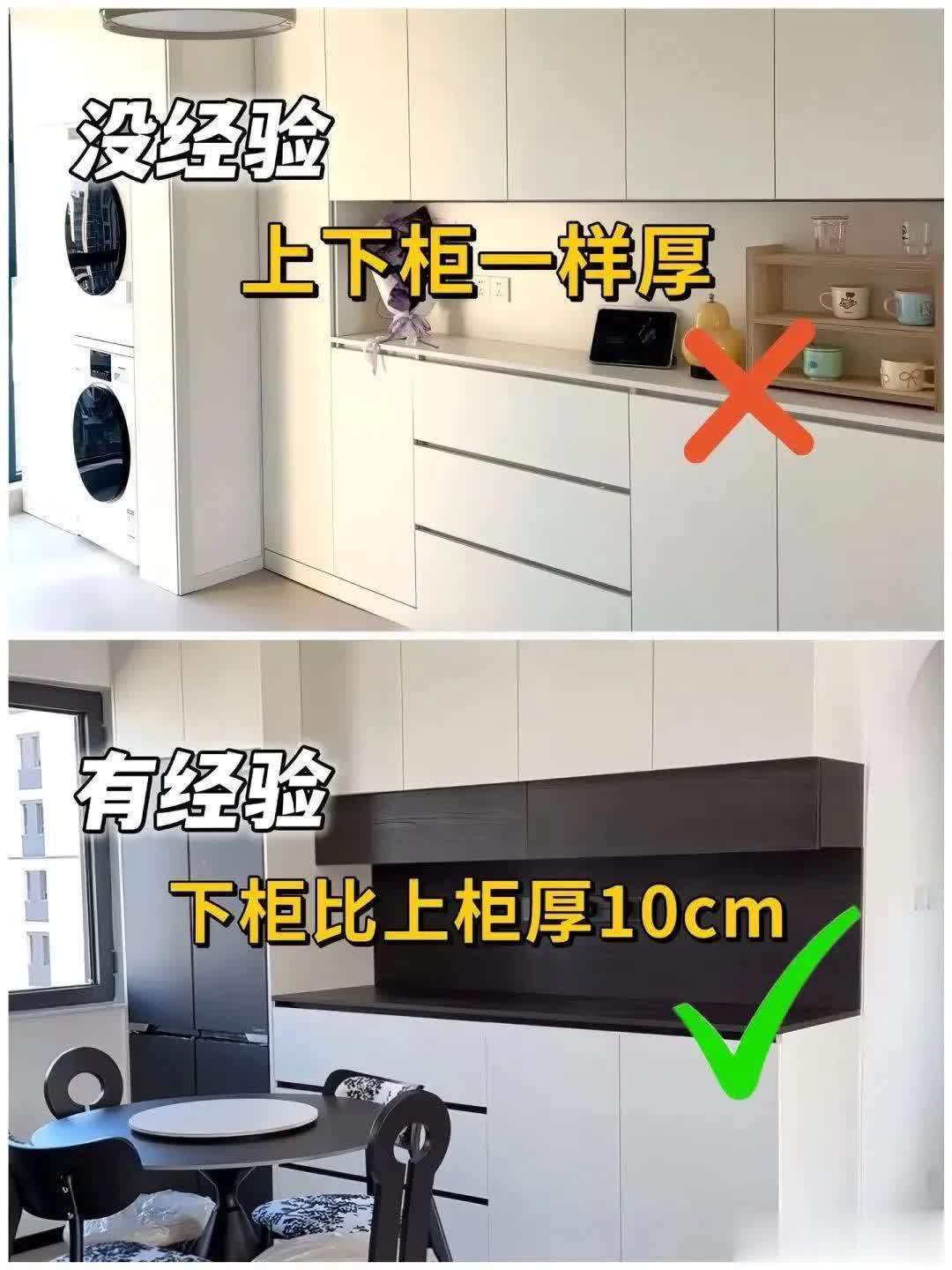 - 下柜比上柜厚10cm:上柜做25cm深、下柜35cm深,随手放碗碟不会碰掉上柜物品!