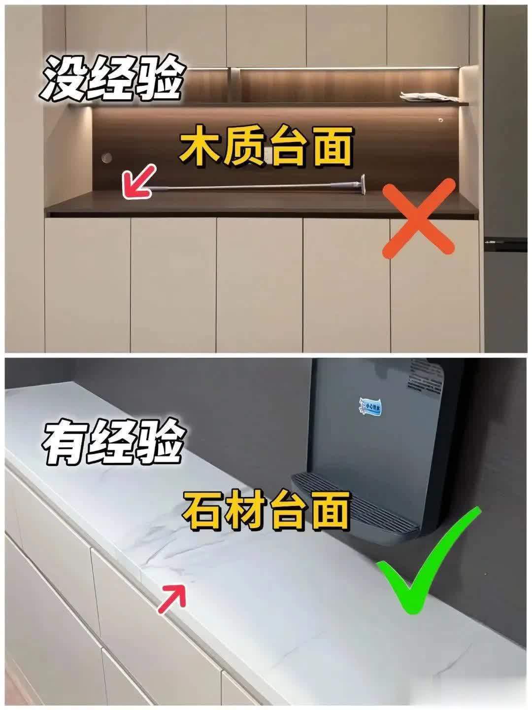 二、材质选择:这些坑我替你踩过- 台面选石材别选木质:木质台面泼上酱油直接染色,石材台面用钢丝球擦都没事!