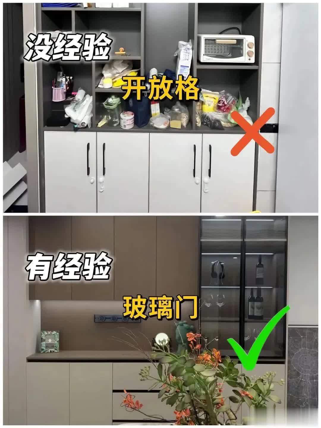 三、功能细节:用着顺手才是真本事- 开放格换玻璃门:开放格3天不擦就落灰,换成玻璃门+内置灯带,颜值高还免打理!