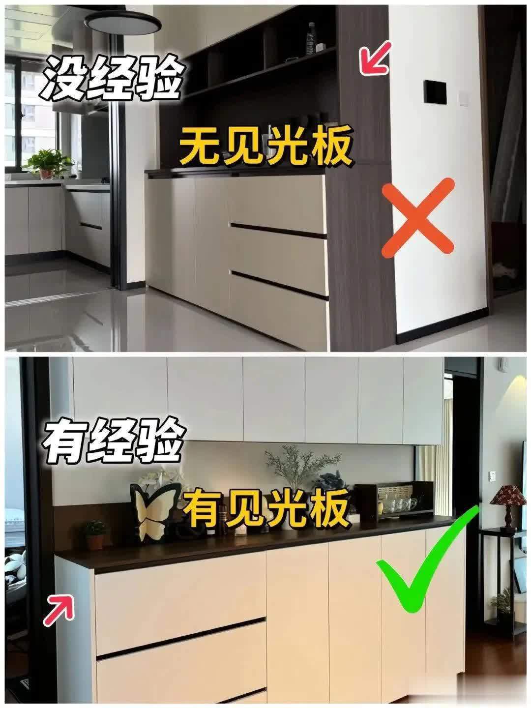 - 见光板必须安排:侧面没见光板露出柜体板,丑到像没穿外衣,选同色板材遮丑!