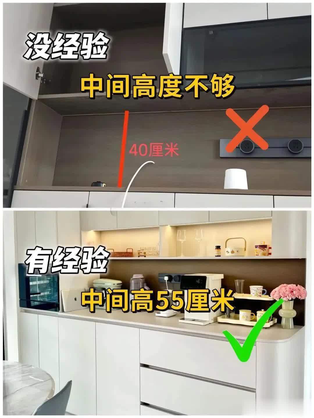 - 中间留55cm黄金高度:留40cm连微波炉都放不下,55cm刚好能放小家电+常用餐具!