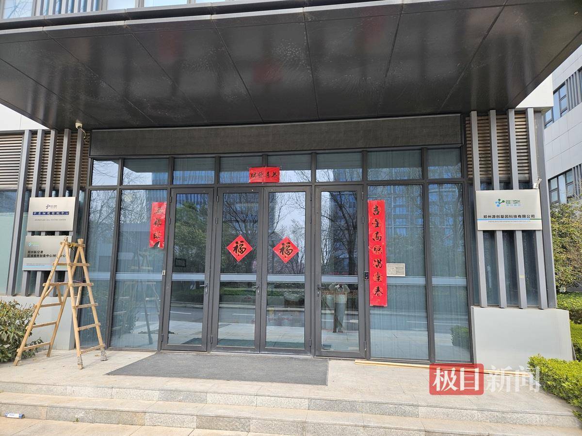 3月16日上午,极目新闻记者实地探访该公司所在地-郑州临空生物医药园的11A源创基因办公楼。一楼门前不仅张贴着公司名称,还有“源创基因中原细胞检测中心”“郑州航空港区域细胞制备、样本中心”的标识牌。走进一楼,大厅内空无一人,地面铺设了防护垫,前台和附近地面堆放着纸箱、油漆桶等杂物,一旁的资质荣誉墙摆放着多块奖牌,内容包括“细胞产业技术创新战略联盟”“省市级知识产权优势企业”“专精特新中小企业”等。